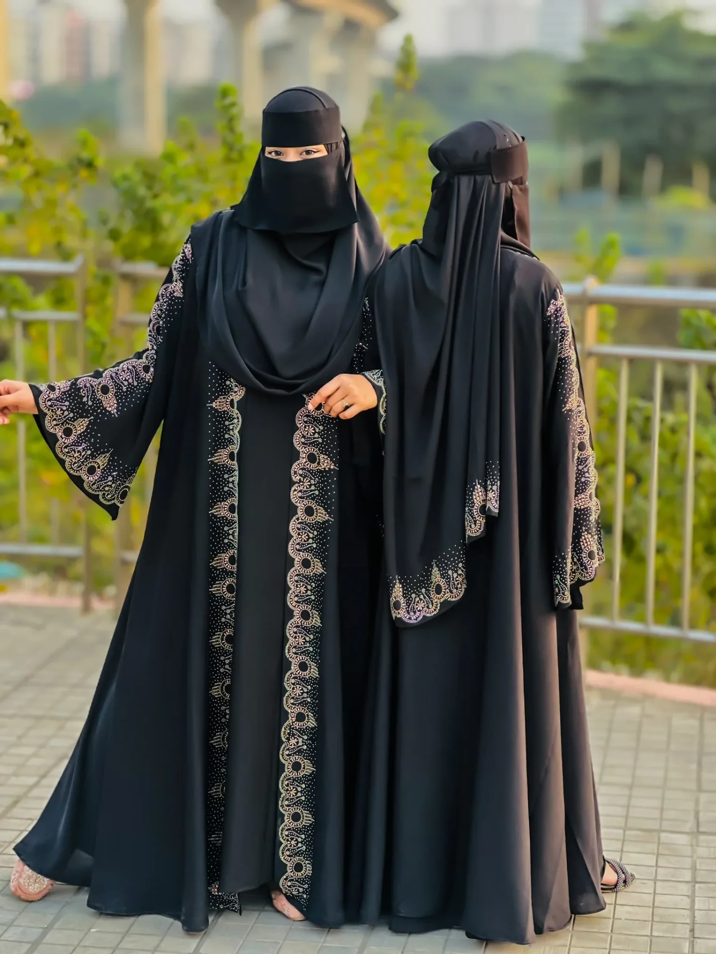 Introducing our elegant Shehzadi Dubai Cherry Stone Work Abaya – a perfect blend of luxury, modesty, and comfort.