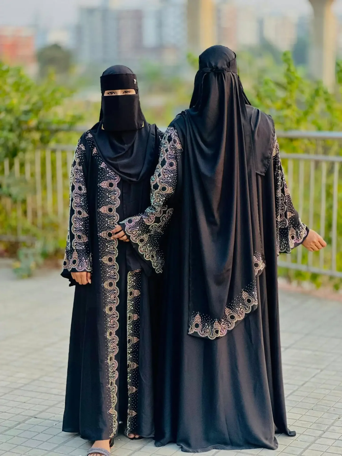 প্রিমিয়াম দুবাই চেরি ফেব্রিকের শেহজাদি আবায়া, আকর্ষণীয় MC ও DMC স্টোন ওয়ার্কসহ। ৪০০+ গের, ফ্রি সাইজ বডি ও লং ৫০, ৫২, ৫৪, ৫৬ অপশন। কটি, ইনার ও হিজাবসহ সম্পূর্ণ সেট।